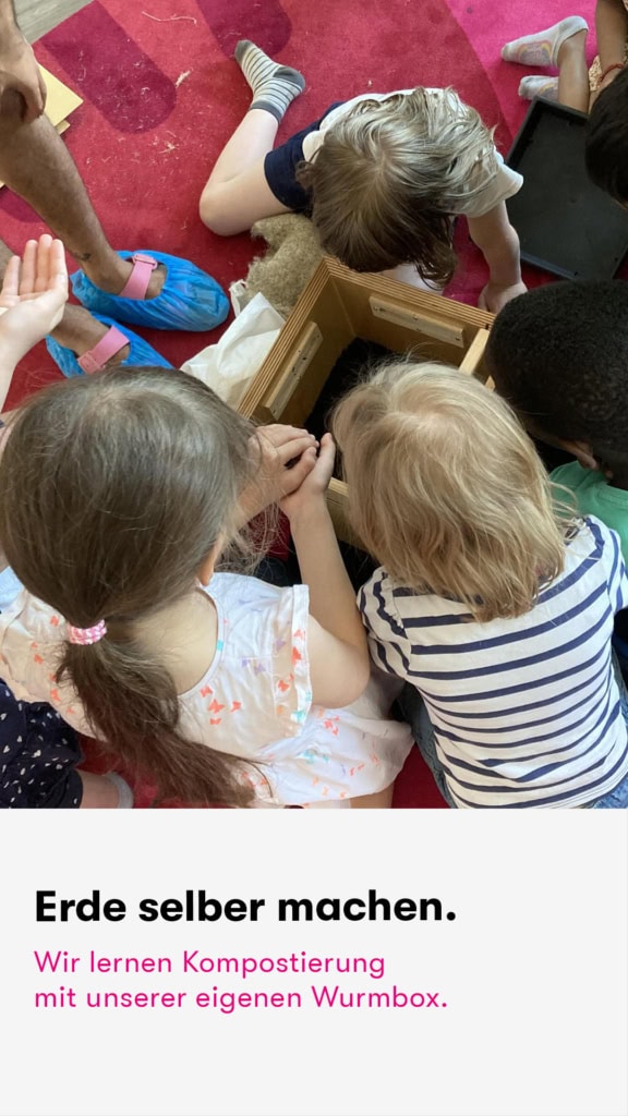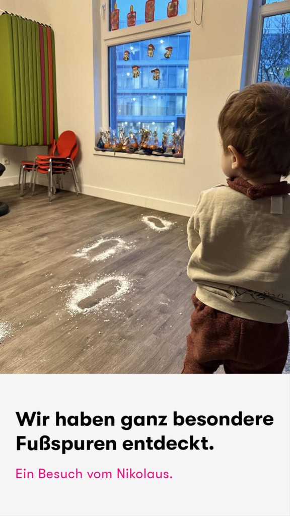 Außerdem lernen unsere kiziKinder mit unserer hauseigenen Wurmbox, was Kompostierung bedeutet und wie Erde entsteht. Größere Tiere entdecken wir gerne im Tierpark oder dem Tropen Aquarium. Wir sind auch gerne im Park oder im Wald unterwegs und entdecken kleine Käfer, Raupen und verschiedene Fußspuren. Ganz besondere Fußspuren gab es übrigens zur Weihnachtszeit, als der Nikolaus uns überrascht hat!