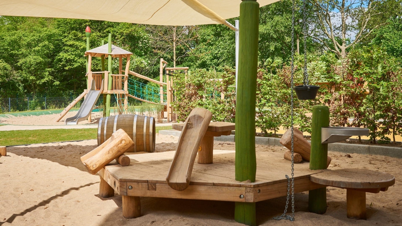 Unsere Kita bietet Kindern eine ideale Umgebung zum Spielen und Lernen. Das großzügige Außengelände lädt kleine Abenteurer ein, altersgerecht zu entdecken. Zwei separate Bereiche sorgen dafür, dass Krippen- und Elementarkinder sicher spielen können.