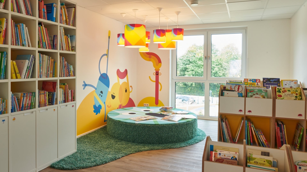 Drinnen warten liebevoll gestaltete Räume und unsere kiziThek, eine Kinderbibliothek voller spannender Geschichten und Wissensschätze. Hier können die Kinder in einer gemütlichen Atmosphäre in Bücher eintauchen.