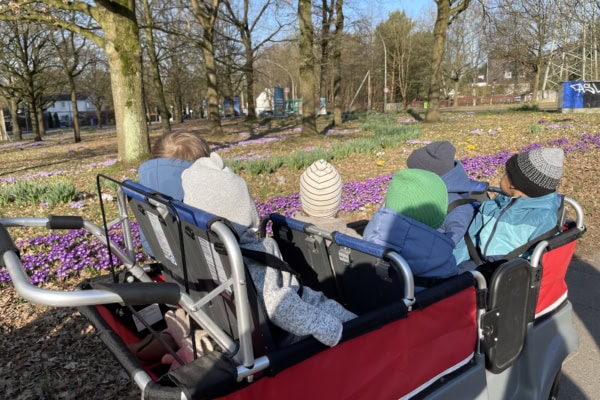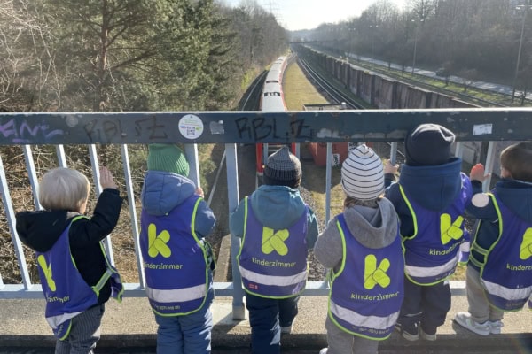 Am Vormittag steht eine Mischung aus Freispiel, kreativen Angeboten und Bewegung auf dem Programm. Die Kinder basteln, experimentieren oder erkunden den liebevoll gestalteten Bewegungsraum. Einmal in der Woche findet ein Ausflug statt, bei dem es beispielsweise in den Wald, auf den Naturspielplatz oder zum Bahnhof geht, um Züge zu beobachten.
